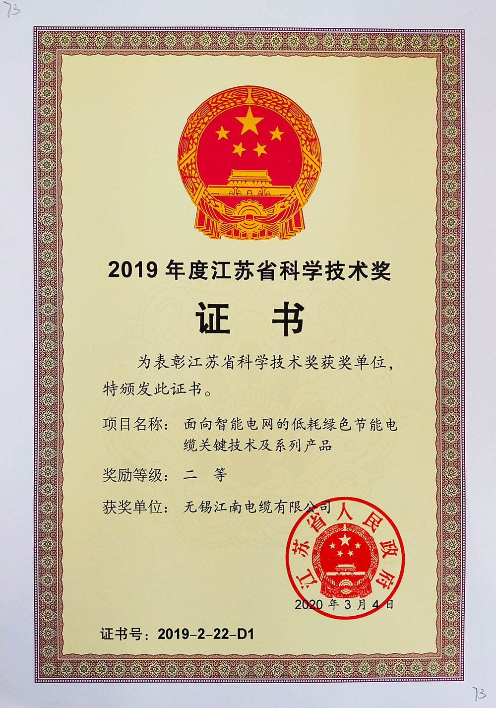 • 江苏科技奖证书