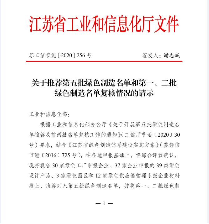 • 苏工信节能〔2020〕256号(1)绿色工厂复审通过