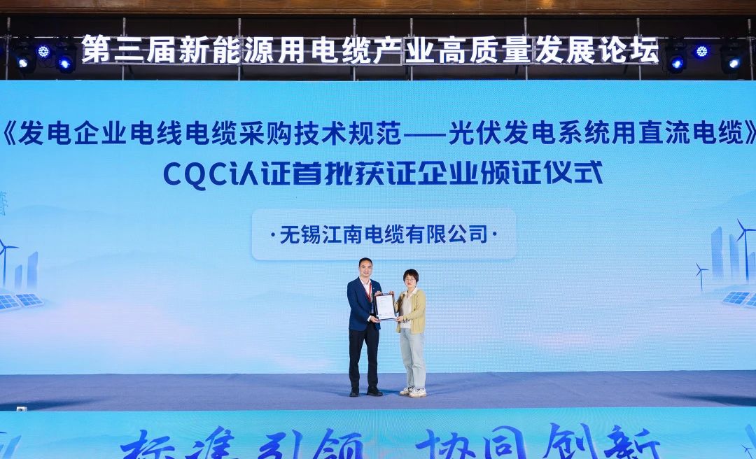 4月18日,江南电缆顺利取得CQC颁发的首批光伏发电系统用直流电缆PV-YJYJ (62930 IEC131)DC 1.5kV 1.5-16mm² 认证证书。现场速递 该认证产品严格遵循团体标准T/CTBA 006.1-2025,这一标准由中国华能集团、国家…
