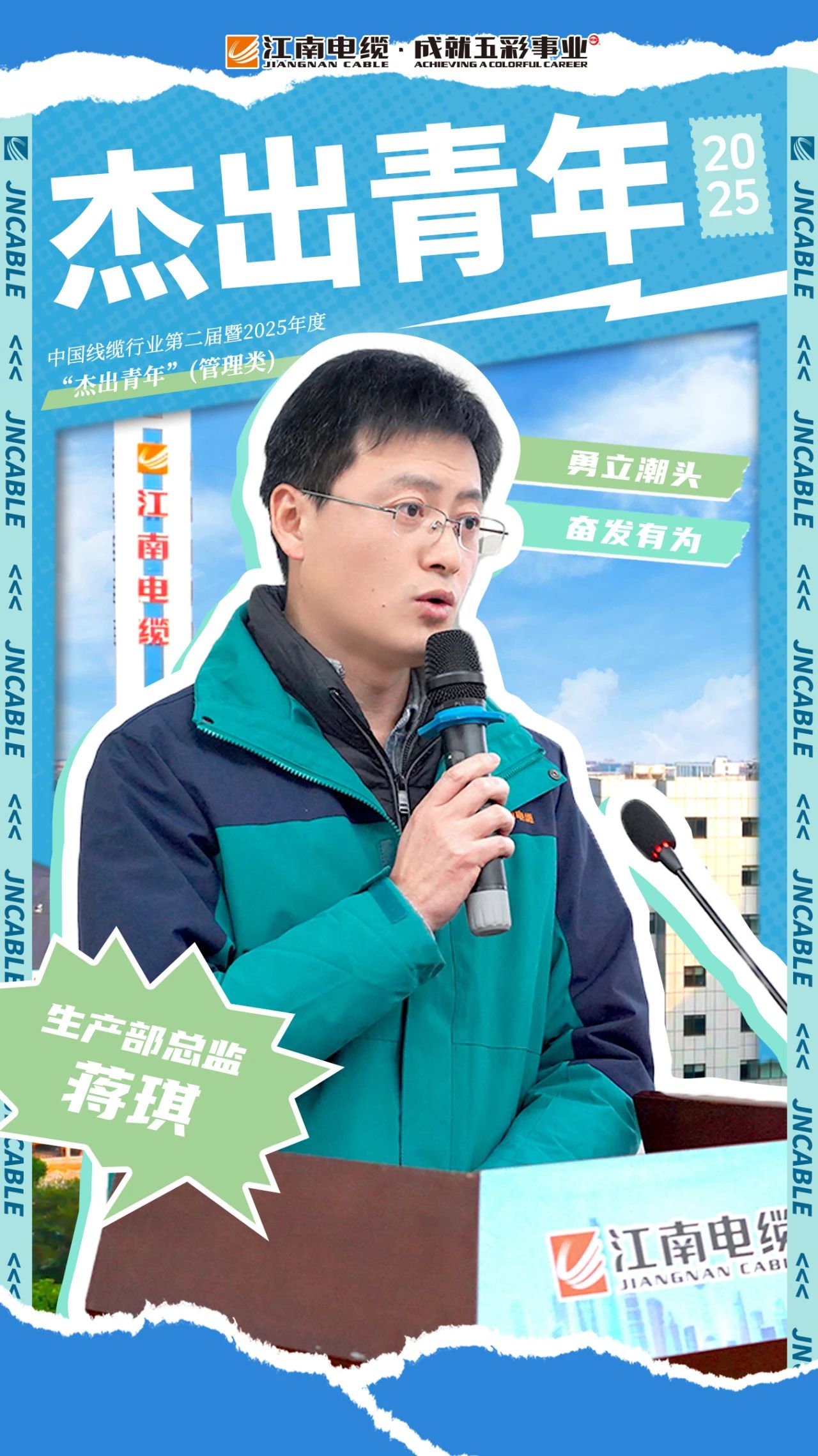5月4日,中国线缆行业第二届暨2025年度“杰出青年”评选结果正式揭晓。江南电缆生产部总监蒋琪荣获管理类“杰出青年”!此次评选活动旨在充分发挥线缆领域优秀青年的示范引领作用,激励广大从业者勇立潮头、开拓创新…