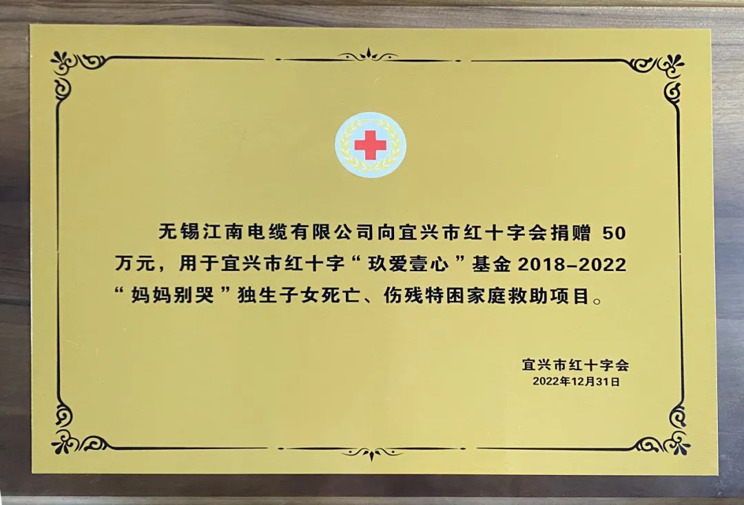 慈善始于心,行善贵有恒。江南电缆始终围绕扶危济困、抢险救灾、捐资助学、助老助残、卫生医疗、乡村振兴等方面,开展常态化、专业化、多样化的公益慈善活动。在完成宜兴市红十字“玖爱壹心”基金项目,救助失独家庭、伤残特困家庭275户,困难家庭165户的同时,又开启了新一轮“玖爱壹心”项目,助力崇高的慈善事业迈向新高峰。