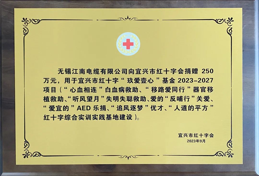三十八年如一日,江南电缆坚持公益、筑梦行善,获得了社会各界的高度肯定:江苏省红十字奉献奖、无锡市红十字功勋奖,公司总经理储辉荣获首届无锡慈善奖最具爱心慈善捐赠个人……张张证书、桩桩善举、拳拳爱心,为江南蓬勃发展注入不竭的精神动力!
